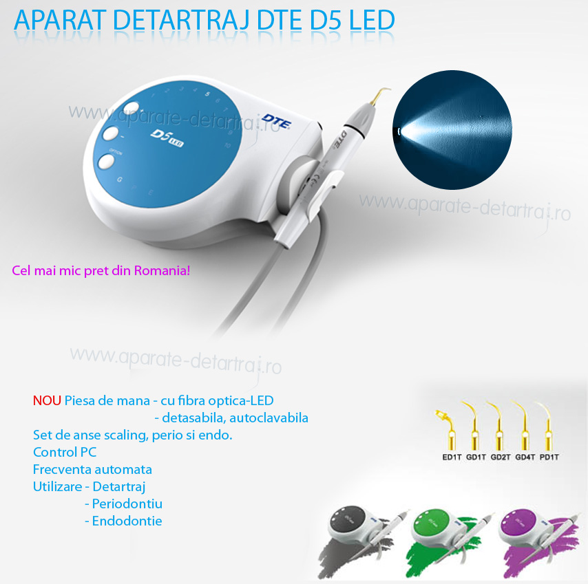 D5 este un aparat de detartraj cu ultrasunete, cu o interfata prietenoasa, greutate mica si dimensiuni reduse. Ansele interschimbabile asigura o arie vasta de utilizare si posibilitatea realizarii unei mari varietati de tratamente.