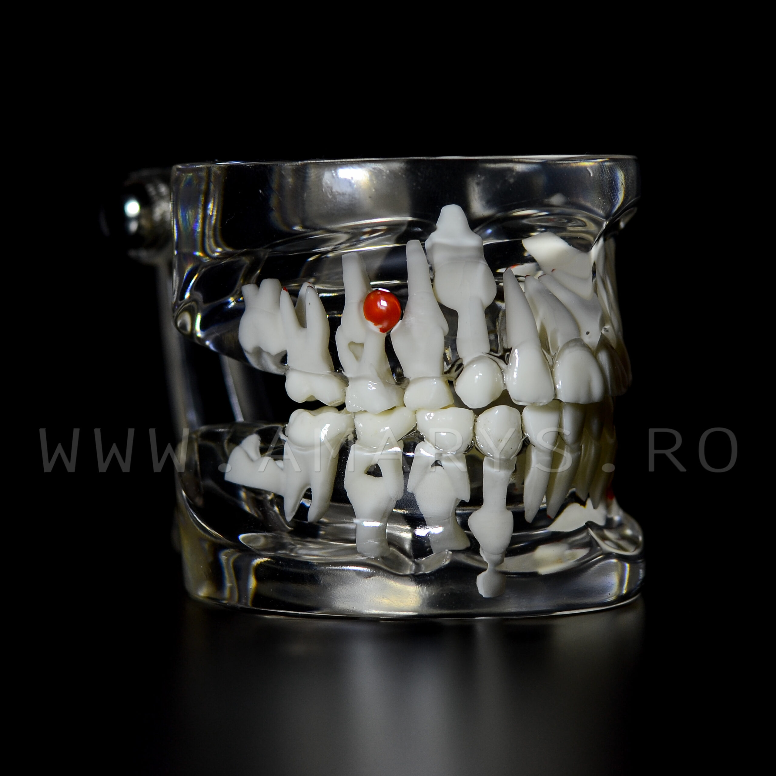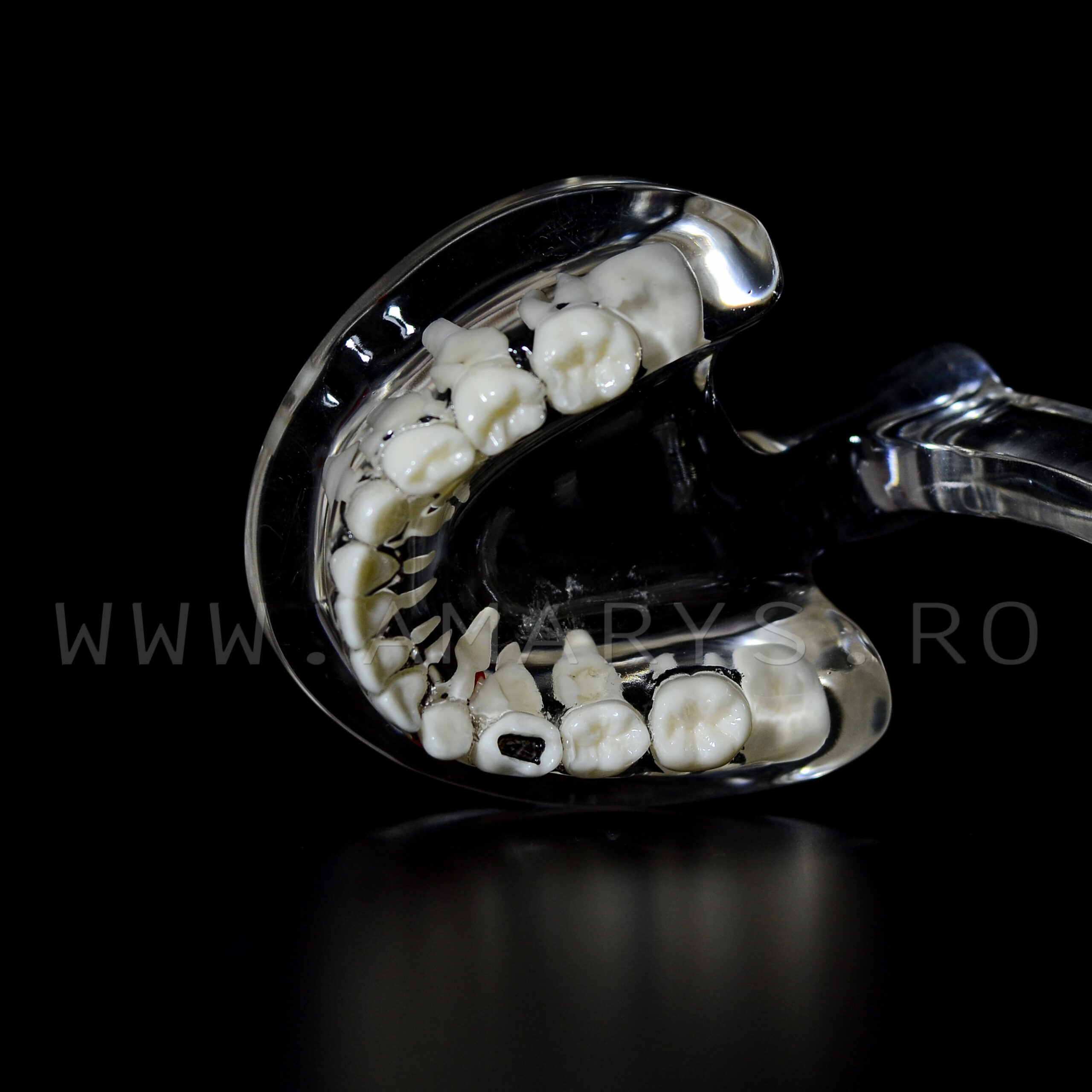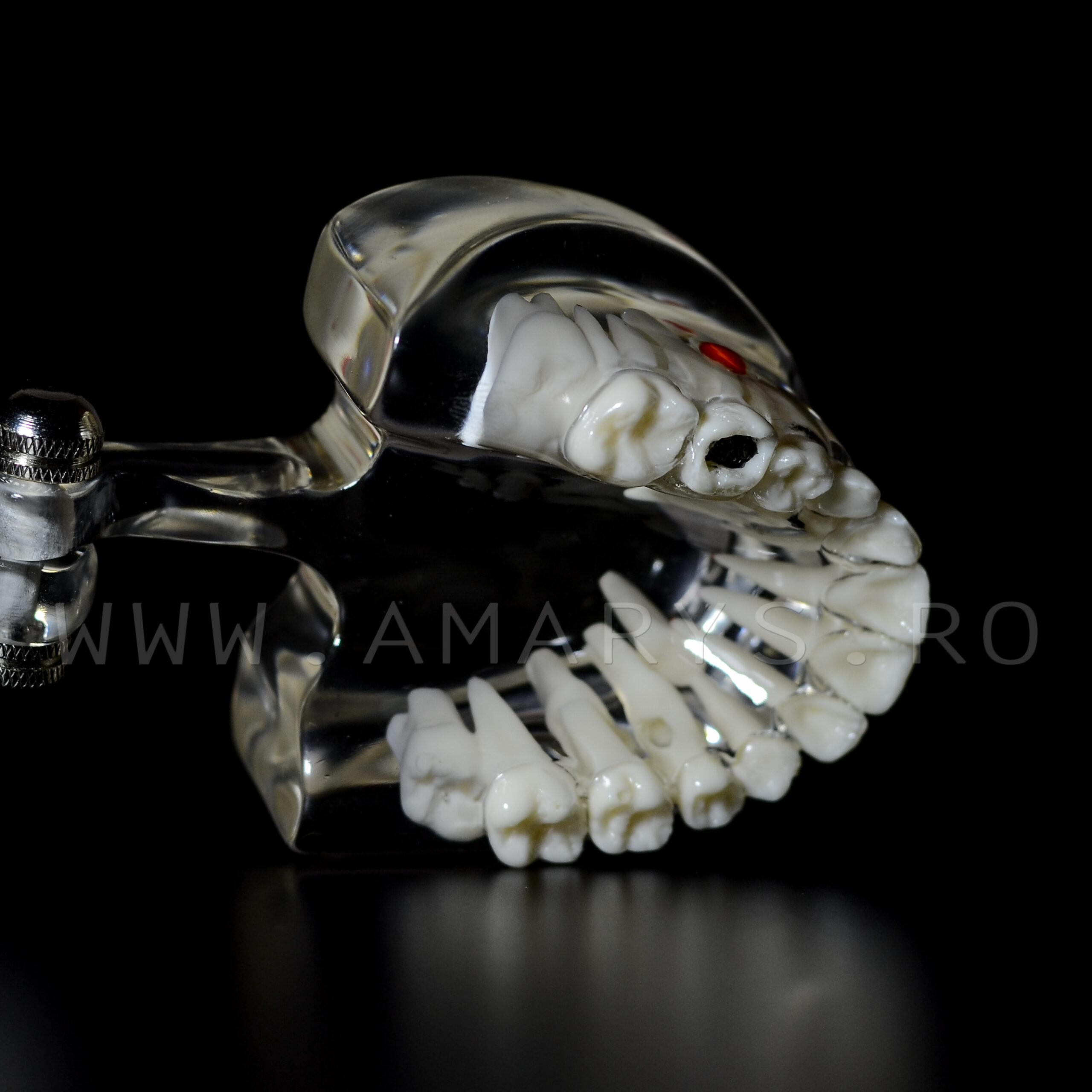 Arcada dentara transparenta, montata in articulator reglabil metalic. Dintii si afectiunile dentare se pot observa datorita materialului transparent din care care sunt confectionate arcadele.
