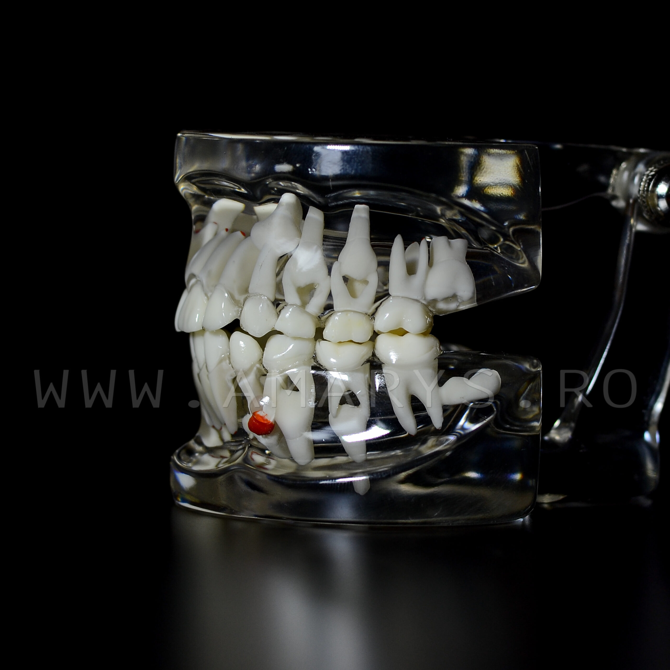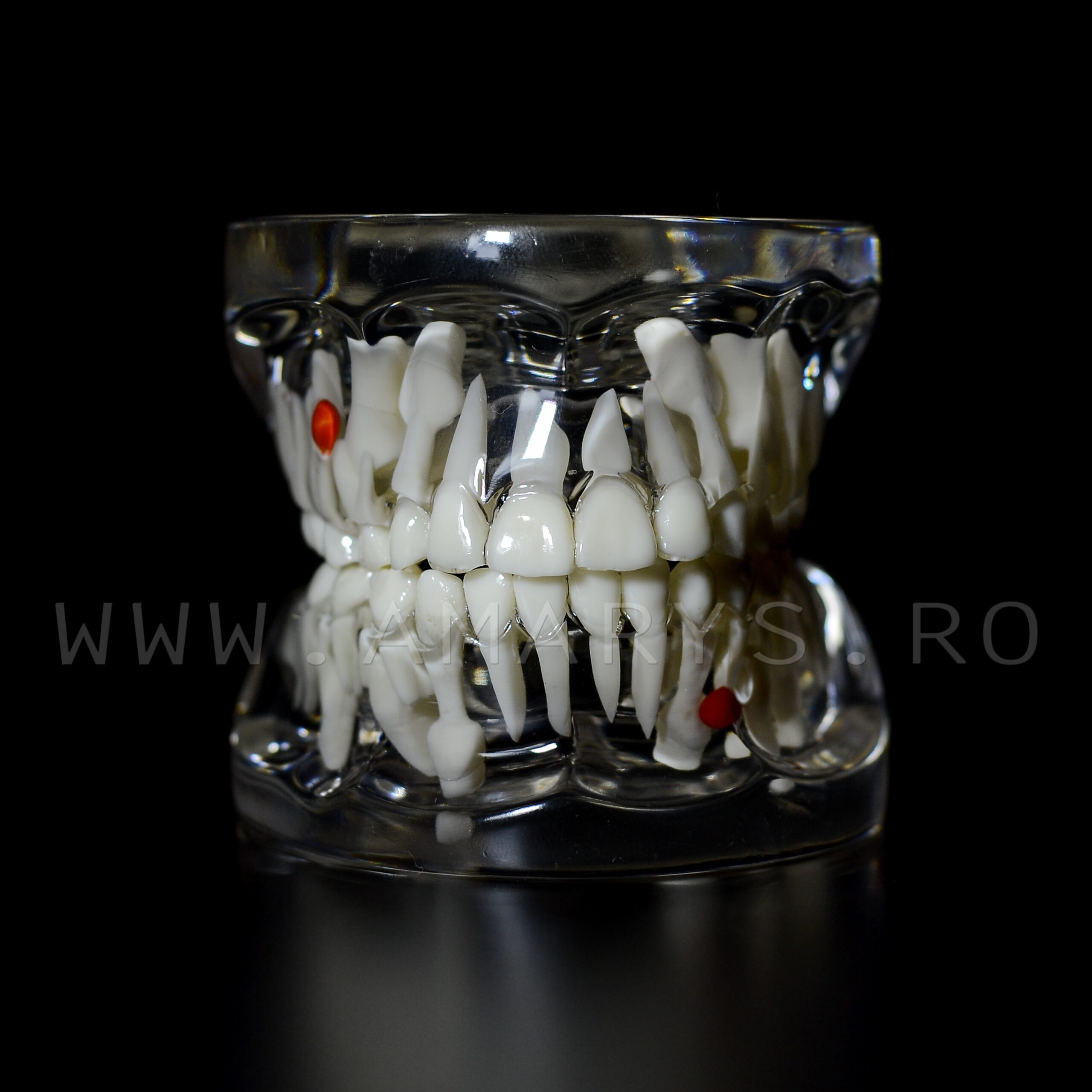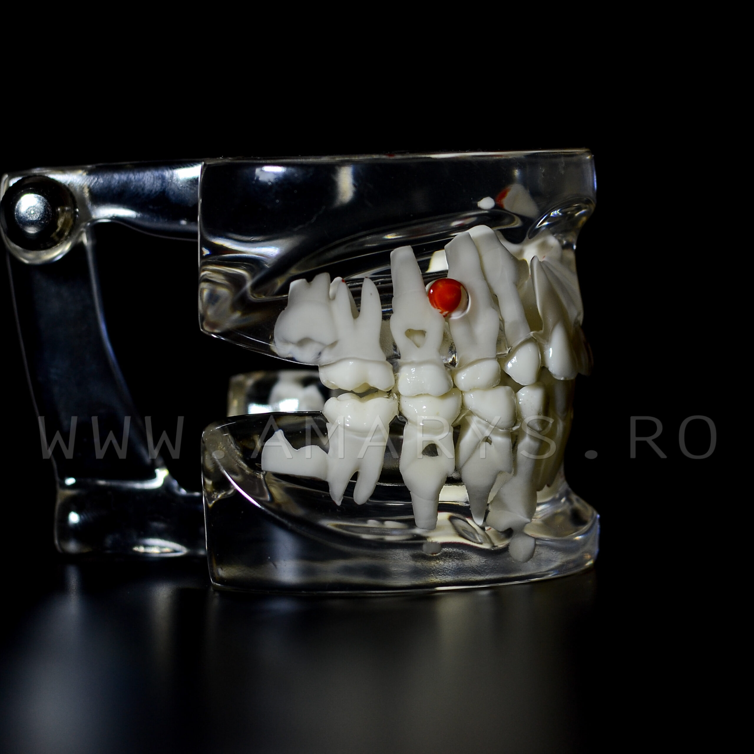 Arcada dentara transparenta, montata in articulator reglabil metalic. Dintii si afectiunile dentare se pot observa datorita materialului transparent din care care sunt confectionate arcadele.
