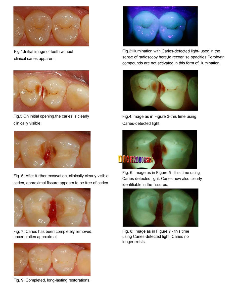 Bacteriile din dentina infectata in procesele carioase lasa produse metabolice (porfirine). Atunci cand cavitatea este expusa luminii uv , porfirinele prezintă o fluorescență roșie, indicând astfel zone importante de carii. In timp ce faceti exereza dentinii va puteti verifica cu UV daca ati indepartat toata dentina infectata dintr o leziune carioasa.